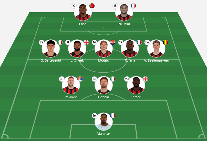 Milan will set up in a 4-2-3-1, aiming to absorb pressure and break rapidly through Leão and Pulisic on the wings. Tonali’s replacement, Yunus Musah, provides energy and ball progression, while Reijnders maintains composure in midfield.