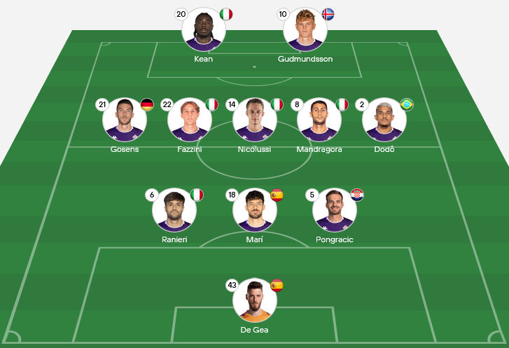 Fiorentina typically line up in a 4-3-3, emphasizing ball circulation and vertical passing. Their full-backs push high to provide width, while the midfield triangle maintains fluidity and defensive cover.
