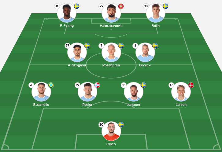Likely formation: 4-2-3-1, similar structural shape as Malmö but likely with a more cautious start.