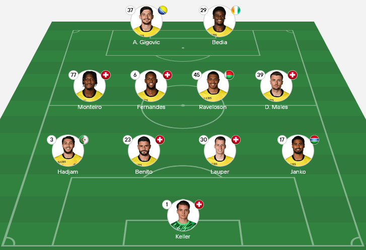 Young Boys typically line up in a 4-2-3-1 formation, pressing high to win the ball back quickly and exploiting wide areas to stretch the opponent’s defense. Their full-backs provide width, while midfielders support both defense and attack dynamically.
